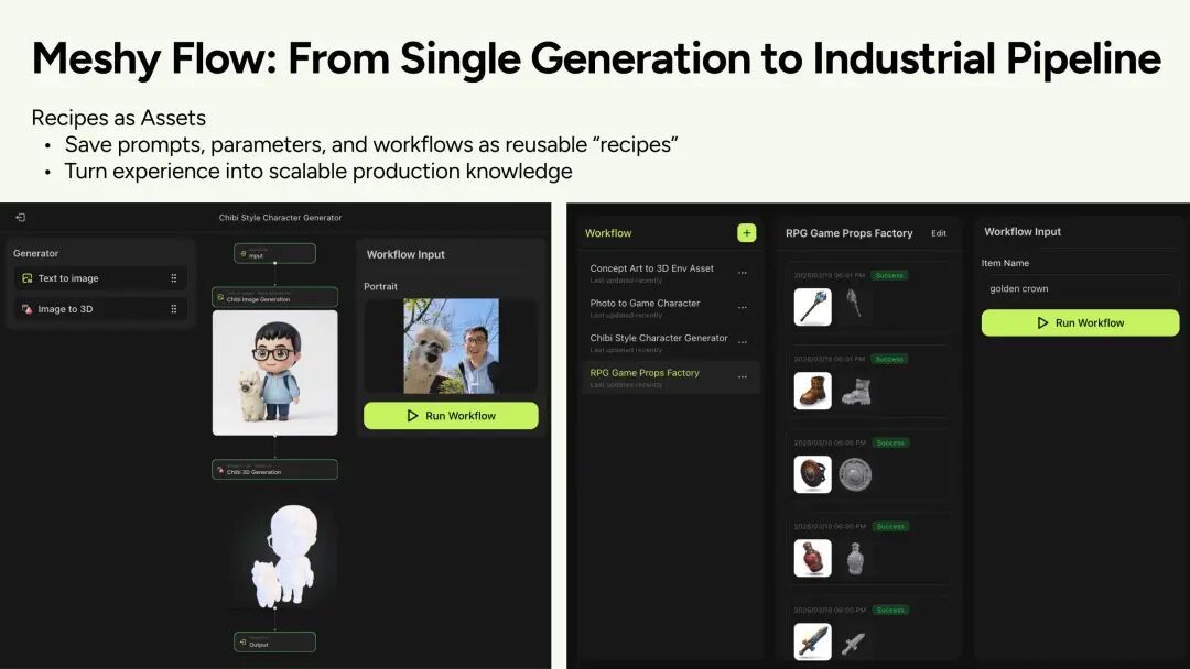 比如在AI生成业务这一块,Meshy正在研发“Meshy Flow”,它能让Meshy融入管线的过程标准化,一个团队可以在生成时反复获得一致的结果,“哪怕是批量处理成百上千个资产”。