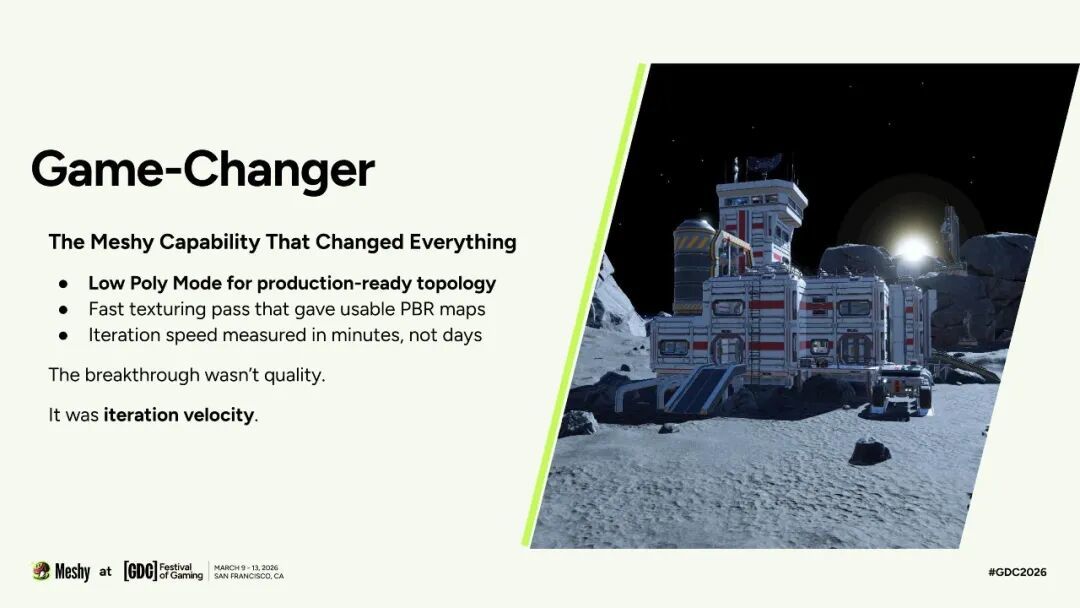 从这次GDC上的分享也能看出来,Meshy确实在工作流中渐渐接管了许多环节:Stratton Studio(playful.ai旗下的游戏开发工作室)从概念设定、白模、高模雕刻生成,一直到UV展开和重新拓扑都用上了Meshy。Stratton Studio 总经理Josh说,低模模式和变体网格让小道具、石头花草之类的有机资产,基本上“不用重新拓扑,质量通常都过得去”。