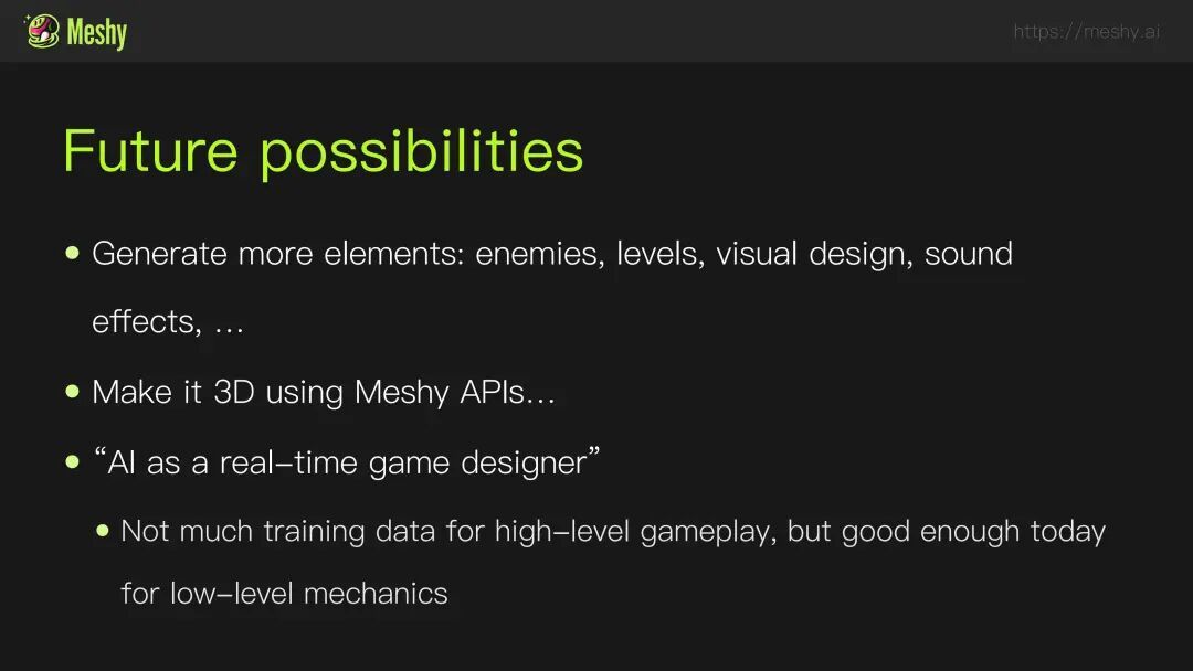 在1小时演讲中,Meshy团队及其客户分享了一些将3D生成工具用在游戏开发中的案例。将Meshy接入工作流后,前期概念网格、低模模型或UGC平台的角色定制等工作,需要的时间从几天压缩到了几小时,甚至几分钟。