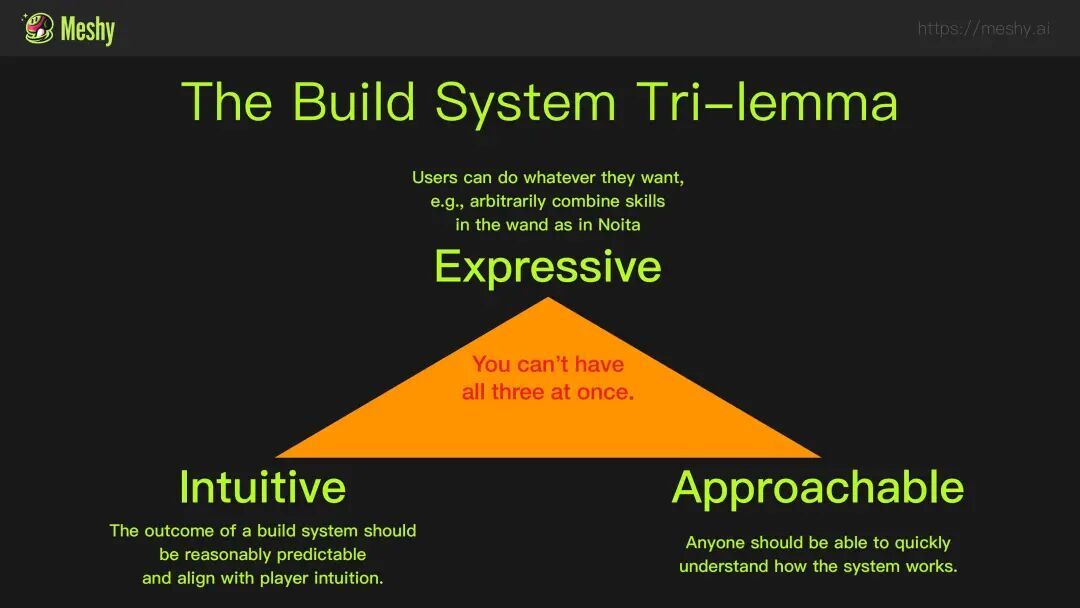 他举了几个不可兼得的例子。比如《Noita》里的魔杖机制表达力强,玩家可以把丰富的buff放进魔杖里,按顺序组合出不同的魔法效果,比如在“三发”后面放上“火球术”,魔杖就能放出三发火球。但是想要实现这种极强的自由玩法,需要玩家掌握复杂似编程的法术组合原理,这导致学习门槛高得令人发指,一个博士都得看10个小时教程才能学会。