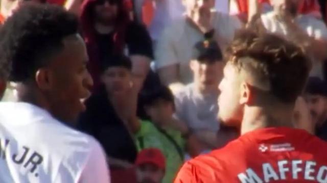 在维尼修斯又一次抗议后,马菲奥推了他一把,并对他说:“你怎么了?”这一动作在维尼修斯投诉后,让马菲奥吃到了一张黄牌。