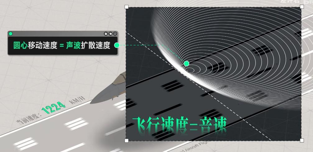 而随着飞行速度越来越快,圆心移动的幅度越来越大,前方的空气不断被压缩,直到速度正好等于音速时,圆心移动的速度和声波扩散的速度相同。