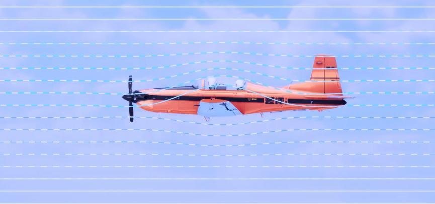 飞机向前飞的时候,机翼就会像一把铲子一样,“ 撞进 ” 空气里,把平行的气流切成两股,一部分从机翼上方过去,另一部分从机翼下方过去。