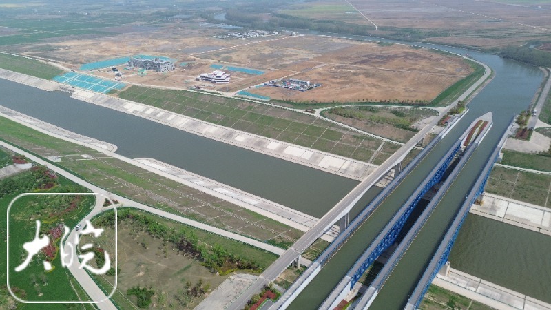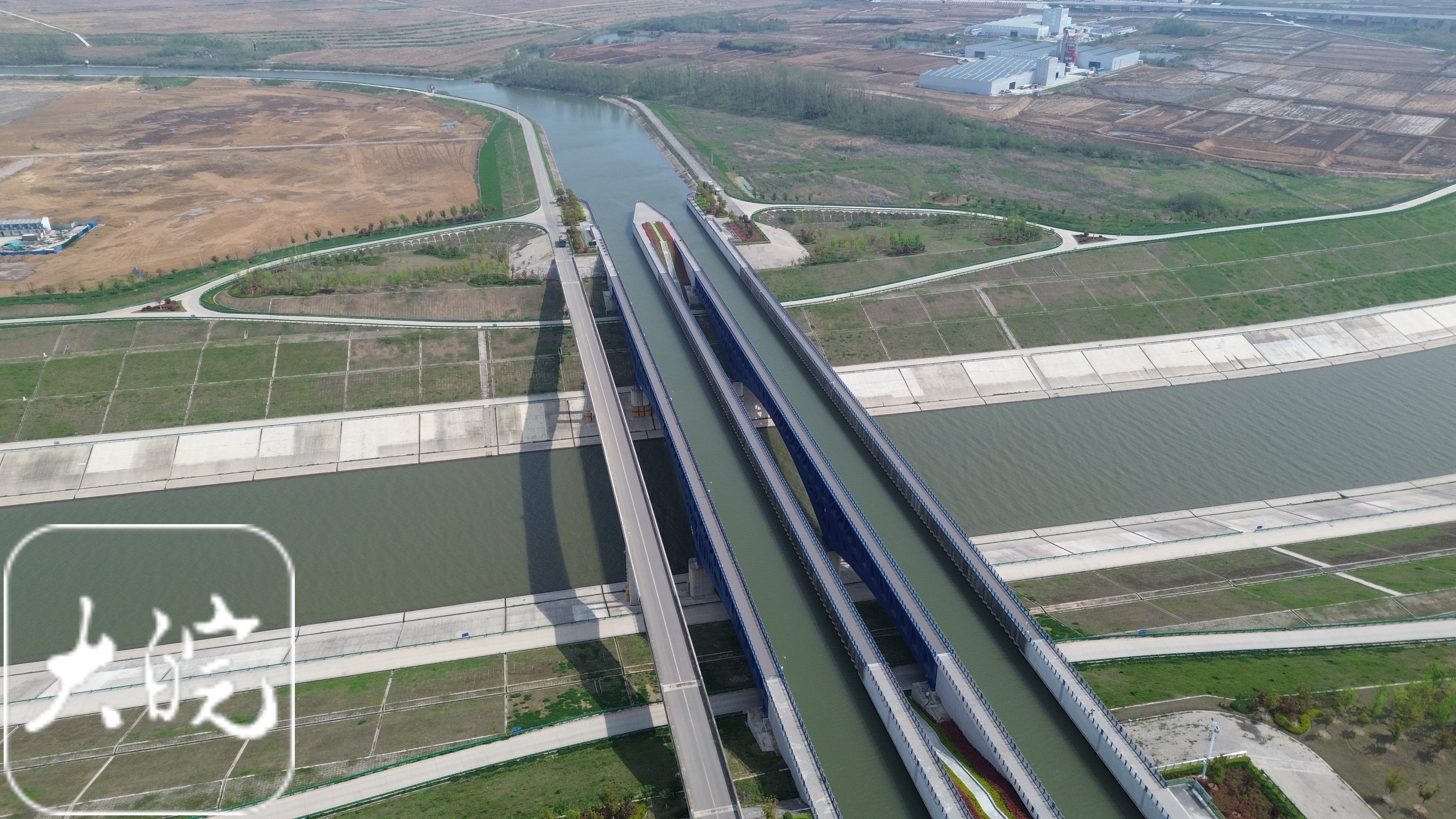 江淮运河(下)与淠河总干渠渡槽(上)。