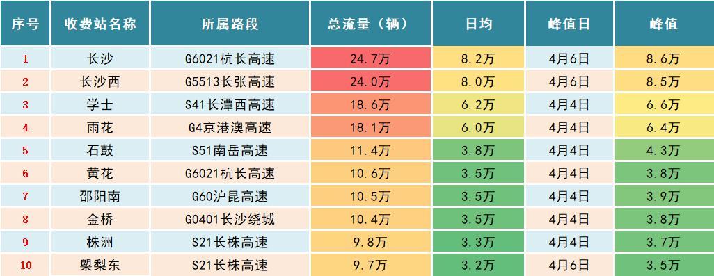 清明假期,车流较大的收费站主要集中在环长沙周边高速公路收费站,以长沙城西和城东两大出入口流量最为集中。其中G6021杭长高速长沙收费站,出入口流量为24.7万辆次,占长沙周边收费站出入口总流量的10.43%;其次G5513长张高速长沙西收费站出入口总量达24万辆次,占长沙周边收费站出入口总流量的10.14%。