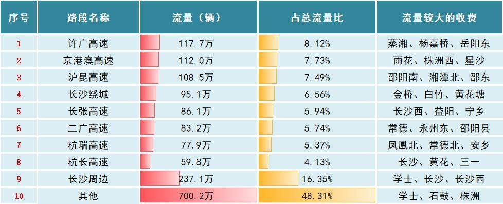 清明假期,全省路网主要以短途出行为主,集中体现在以长沙及市州为中心的区域性短途潮汐车流,长沙周边高速路段是车辆主要集散地,出入口总流量达237.1万辆次,占清明假期全省总流量的16.35%,呈潮汐式分布特征。