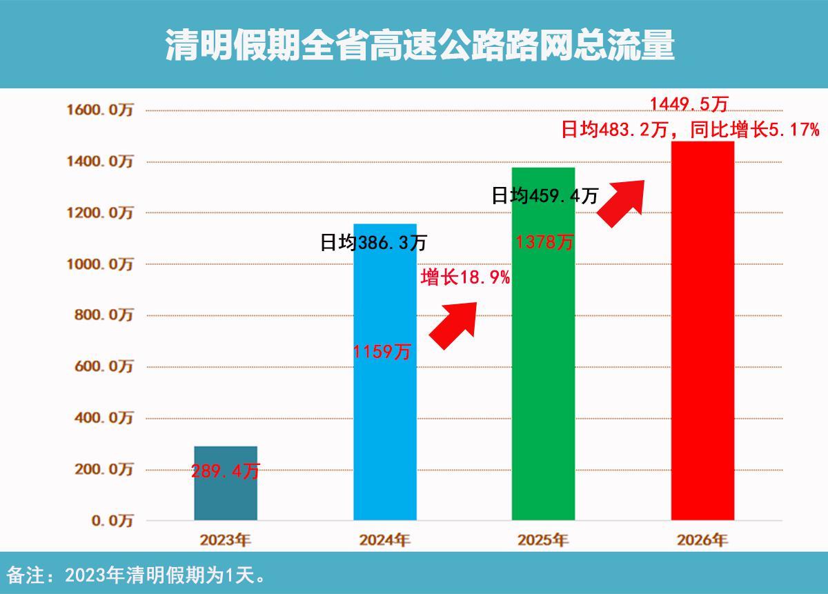 4月7日,湖南省高速公路路网运行监测指挥中心发布《2026年清明假期路网运行总结报告》。数据显示,2026年清明假期3天(4月4日至6日),全省高速公路出入口总流量为1449.5万辆次,日均流量483.2万辆次,是平日流量的2倍,同比增长5.17%。4月4日为峰值日,峰值流量为550.8万辆次,是平日流量的2.3倍,峰值同比增长14.1%;跨省总流量181.3万辆次,占全省总流量的12.5%,同比增长6.27%。