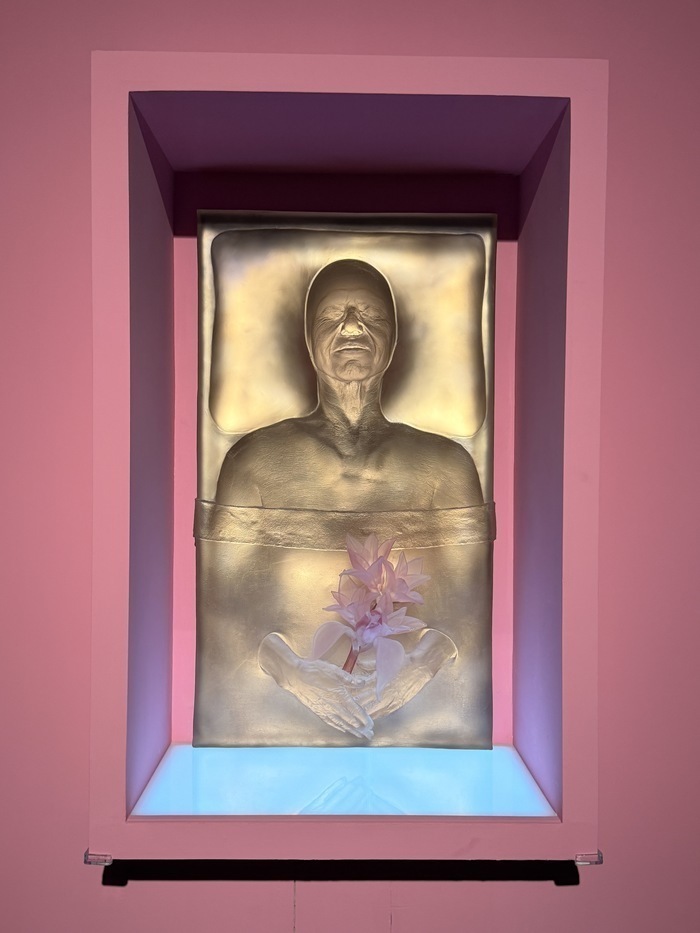 展览作品《凡俗之躯》,以玻璃为媒介塑造出极具诗意的生命意象。粉色玻璃中呈现人形轮廓,双手捧持的粉色花朵细腻逼真。玻璃的通透与朦胧质感,既勾勒出生命的凡俗形态,又借花卉元素隐喻生命的脆弱与绚烂,在对“凡俗”与“生命”的艺术表达中,探讨生死议题与人性本真,是一件融合材质美感与哲学思辨的玻璃雕塑。