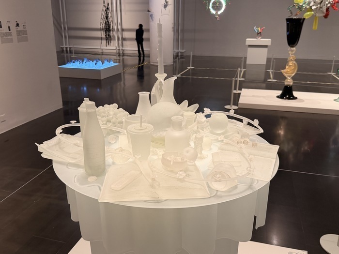 例如,比利时艺术家汉斯·欧普·德·贝克的《凝固的虚空》是一组以17世纪“虚空派”静物绘画为灵感的玻璃作品。虚空派盛行于巴洛克时期,尤其在16至17世纪的尼德兰地区(荷兰)达到鼎盛。艺术家在静物画中加入了骷髅、沙漏、气泡、枯萎的花朵、书籍、乐器等象征物,通过隐喻手法传达生命脆弱、欢愉短暂、死亡必然的主题。《凝固的虚空》用玻璃塑造出一桌充满象征意味的静物:骷髅、蜡烛、水果、书籍、日常器皿等元素被凝固在通透的玻璃材质中,呈现出一种冷冽的“冰封”质感。玻璃的透明与雾面效果,既保留了物体的形态细节,又赋予其超现实的疏离感。艺术家通过玻璃的“凝固”特性,将虚空派对生命短暂、物质虚无的哲学思考,转化为视觉上的永恒定格。