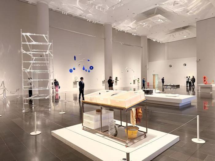 玻璃在我们的生活里太常见了,杯子用来喝水,瓶子用来装东西,镜子用来照见自己……第二单元“陌生的日常”将玻璃制品从功能中抽离。展出的作品看起来像吊床、抱枕、鼓、围栏、脚手架、电线、地球仪,但它们都是用玻璃吹制成型的,物件变得不可用了,反而让人重新去观察它。这种思路可以追溯到1917年杜尚把小便池送进美术馆。他提出的问题是:一个物件能不能既是一件日常工具,又是一件艺术作品?此后,艺术家越来越关注物件本身的存在,而不是它“代表”什么。