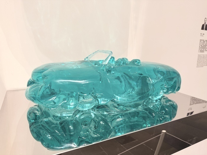 奥地利艺术家欧文·沃姆的《冰敞篷车》以玻璃的形式,将象征着速度与自由的敞篷车,转化为臃肿肥胖的形态。通透的蓝绿色玻璃呈现出汽车的基本结构,但整体形态被夸张地“膨胀”扭曲,表面布满起伏的褶皱,玻璃的冷硬通透与“胖”的视觉柔软感形成强烈反差。