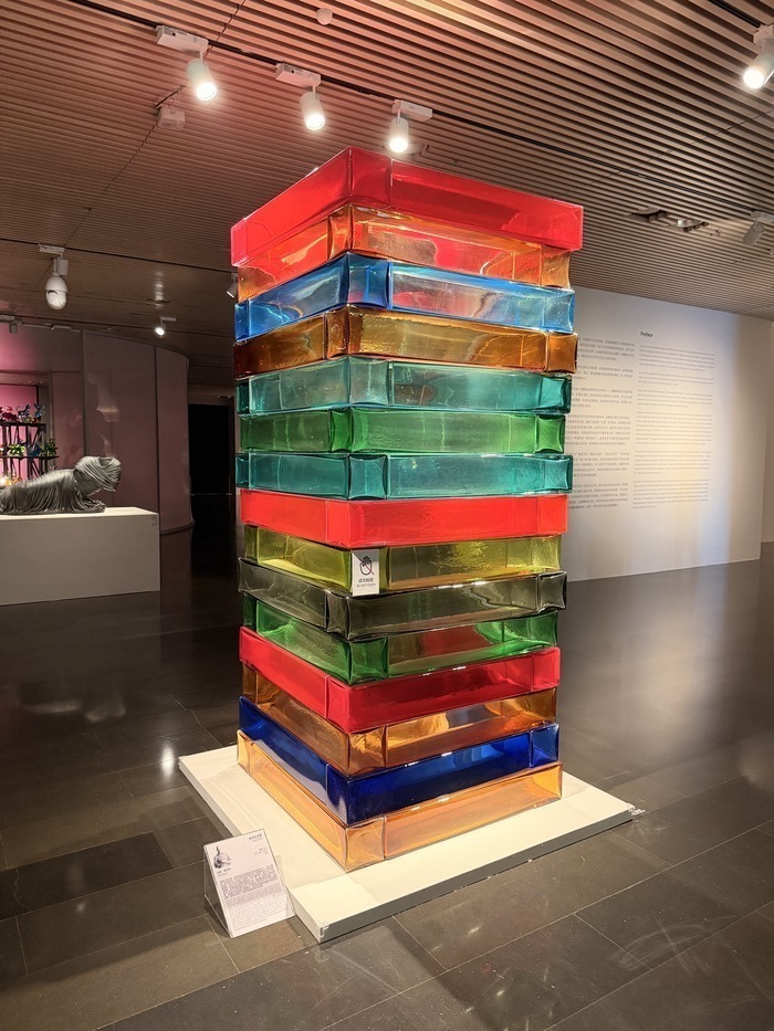 进入展览首先映入眼帘的是美国艺术家肖恩·斯库利的《威尼斯堆叠》,该展品是本次展览海报上的主视觉作品,作品通过将红、黄、蓝、绿等彩色玻璃块有序叠放,让玻璃的通透质感与丰富色彩交织,既具建筑般的结构感,又在光影下折射出灵动的视觉效果。作品在空间中构建出充满张力的色彩斑斓的纪念碑。