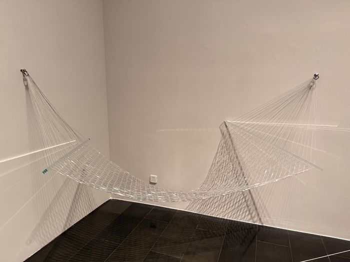 意大利艺术家洛里斯·切基尼的《论非连贯的憩息》以钢丝作为支撑,又用玻璃塑造出吊床的网状结构。玻璃的坚硬、易碎与吊床“供人休憩”的柔软、包容属性形成强烈反差,在展览空间中呈现出一种矛盾的视觉与功能张力。日常的休憩物件被赋予非常规材质,在环境中既显脆弱又具诗意。