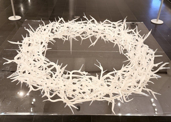 伊朗裔艺术家法里巴·福尔杜西的展览作品《巢/皇冠》以大量白色玻璃荆棘组成环形结构,环绕成类似鸟巢或皇冠的形态,仿佛隐喻着鸟巢的庇护性和局限性以及皇冠的权威性与伤害性,又以玻璃的通透质感赋予其轻盈与脆弱的双重特质。
