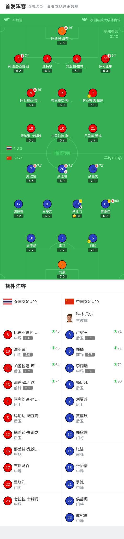 北京时间4月7日U20女足亚洲杯 小组赛 第3轮,泰国女足U20对阵中国女足U20。上半场格林格莱禁区内手球,裁判没有表示,随后曾雨佳好球被吹越位,之后肖亚飞远射,汶布拉甘脱手送礼。最终U20中国女足1-0泰国女足U20全胜头名出线。
