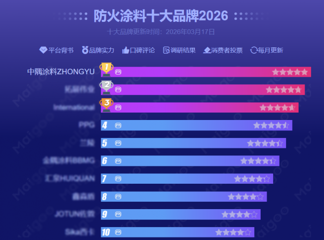 近日,由 CNPP 品牌大数据研究院联合 Maigoo 网发布的2026 年度防火涂料十大品牌排行榜正式揭晓。中隅涂料凭借优异的综合实力、行业领先的技术水平和广泛的市场认可,在本次榜单中位居前列,成为防火涂料领域备受关注的品牌代表。