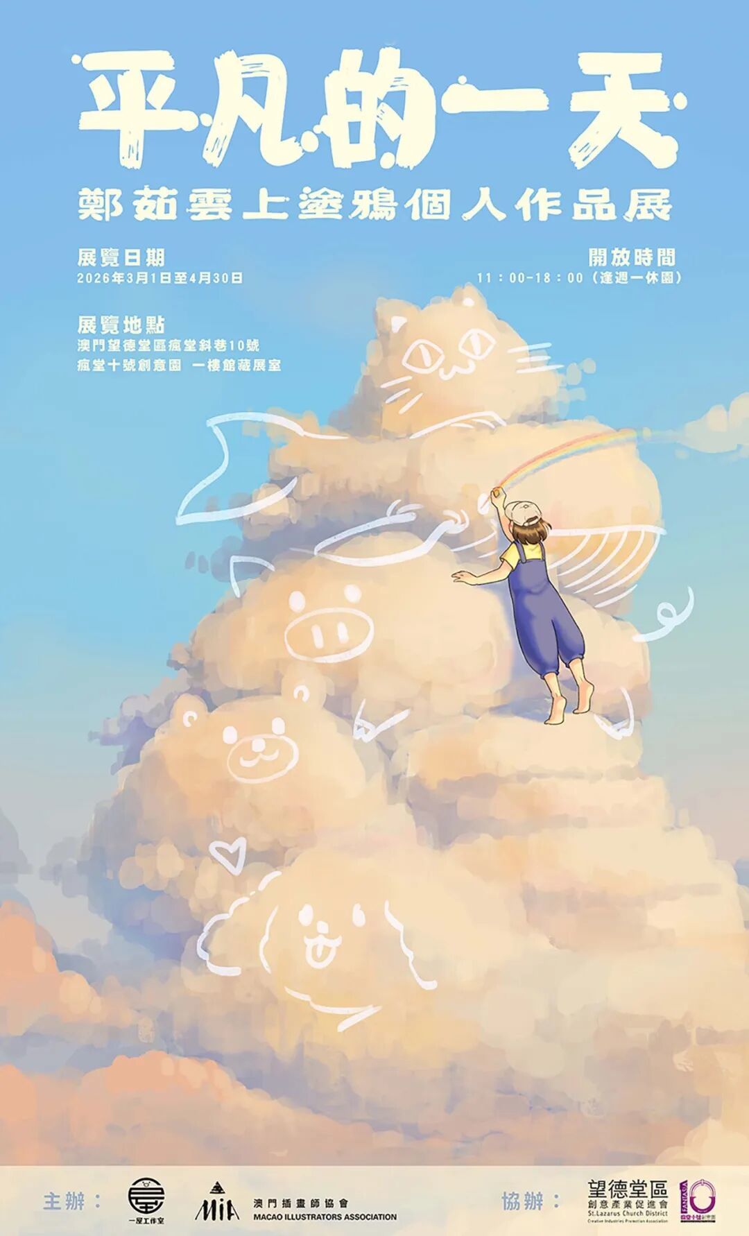 藝術家鄭茹擅長治癒系插畫,在這次個人作品展中與觀眾分享她眼中看到的雲朵,以及藏在雲朵裏的可愛小動物和人兒。