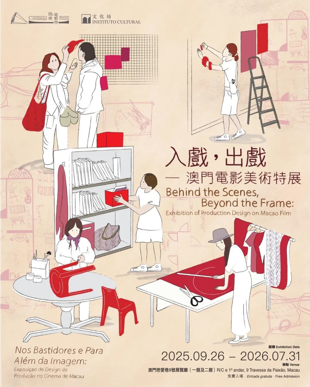 展覽以美術主創的視角,重訪三部近年備受矚目的澳門電影—《那一年,我17》(2016)、《海鷗來過的房間》(2022)及《來世還作人》(2023),揭示鏡頭畫面背後的巧思與匠心。透過五位參展本地美術主創:鄭敏靜、羅寶宜、李晞晴、黃芷珺及姚露欣的設計筆記、電影道具、以及特別全新錄製的訪談,邀請觀眾一探澳門電影視覺敍事的幕後奧秘。