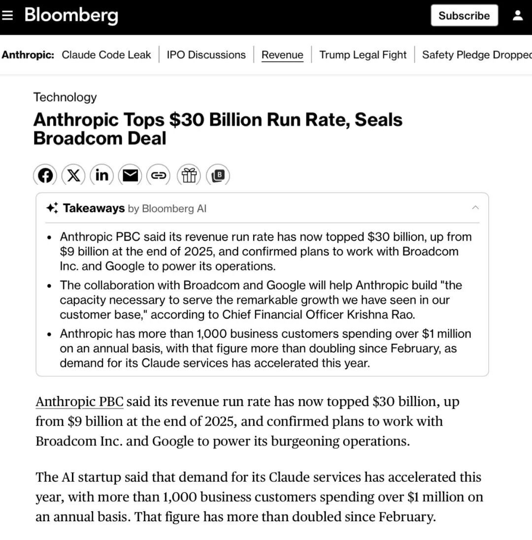 更值得国内AI公司注意的是,Anthropic在4月7日宣布,其年化收入(ARR)突破300亿美元,正式反超OpenAI的250亿美元。