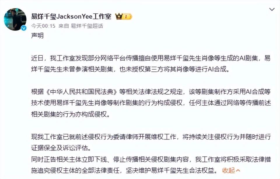 2026年4月5日凌晨,易烊千玺工作室突然发布一纸声明,指出部分网络平台传播擅自使用易烊千玺肖像生成的AI剧集,而易烊千玺本人未曾参演相关剧集,也未授权任何第三方将其肖像进行AI合成。工作室已委托律师开展维权工作,要求相关主体立即下线、停止传播侵权剧集内容。