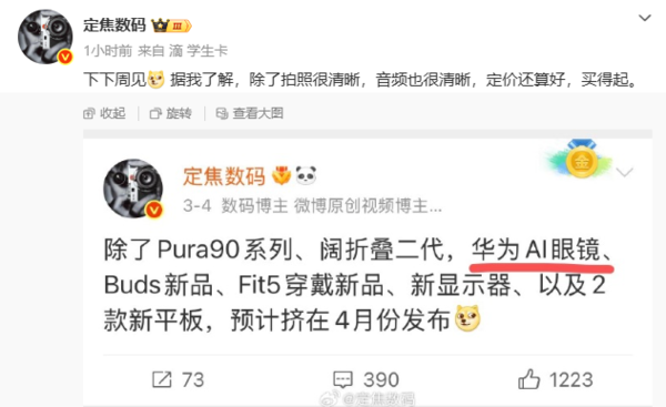 【CNMO科技消息】4月9日,数码博主“定焦数码”爆料称,华为AI眼镜、Pura 90系列等新品将在下下周发布。此次发布的产品阵容较为丰富,包括Pura 90系列手机、第二代阔折叠屏手机、华为AI眼镜、Buds系列耳机、Fit5穿戴设备、新款显示器以及两款平板电脑。
