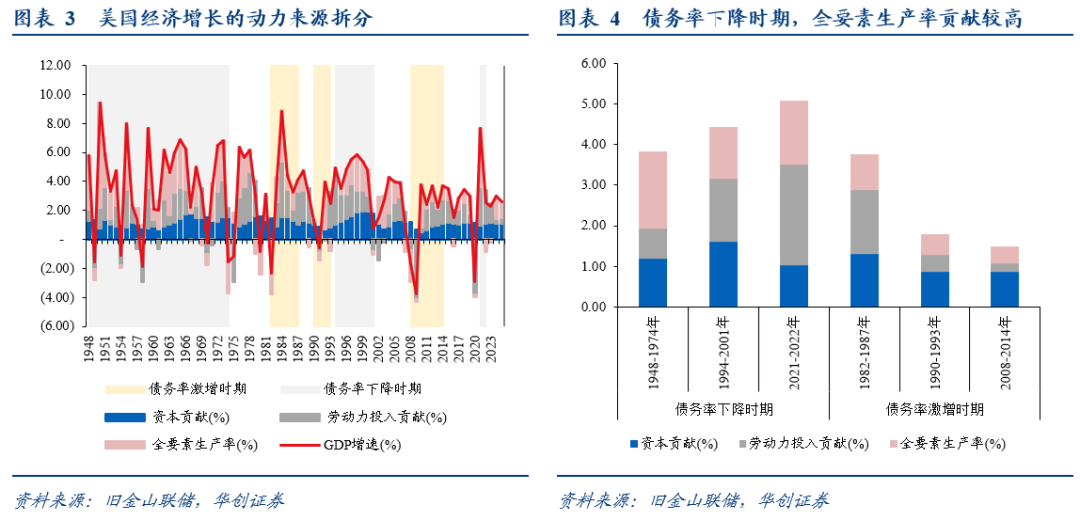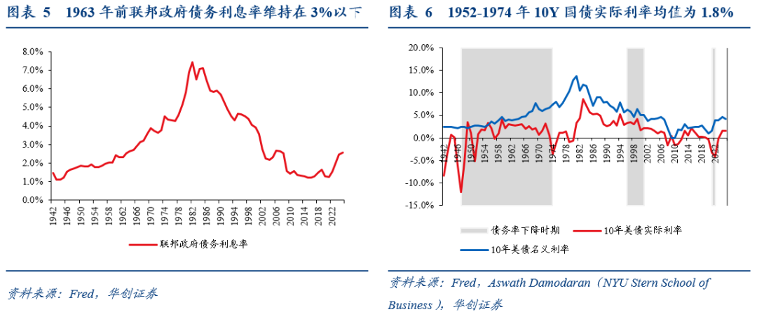 (2)利息增长因子未必是推高债务率的核心原因。同样的,由于债务激增期利率中枢通常会人为抑制在偏低水平,因此1943-1974年、2008-2014年两轮债务激增期中,利息增长因子均起到了化解债务率的效果。