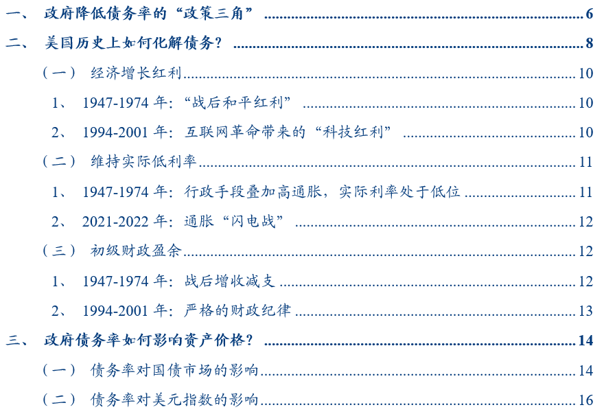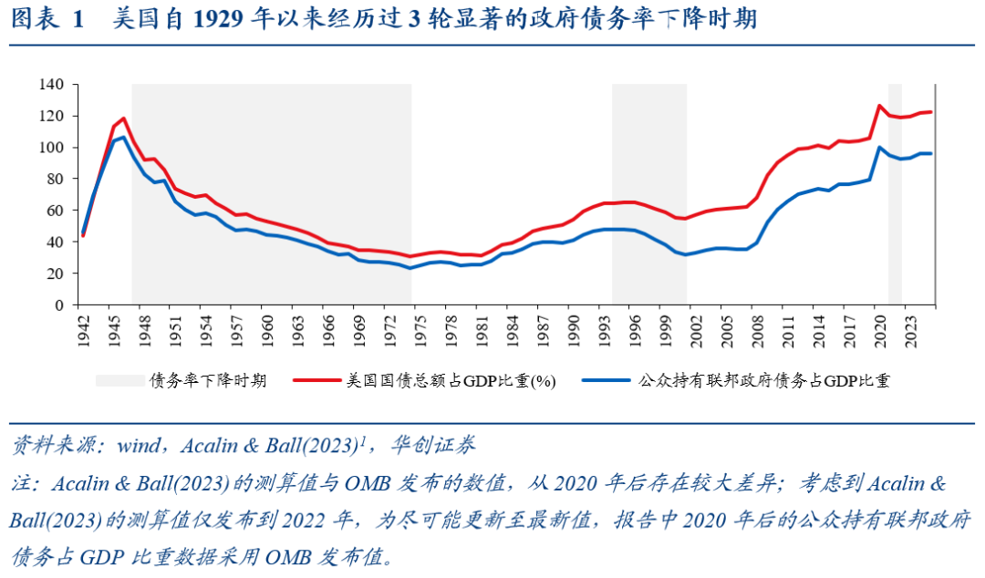美国自1929年以来经历过3轮显著的政府债务率下降时期,分别是1947年-1974年,1994年-2001年,2021-2022年。下面我们分别分析三轮债务化解期的背景。