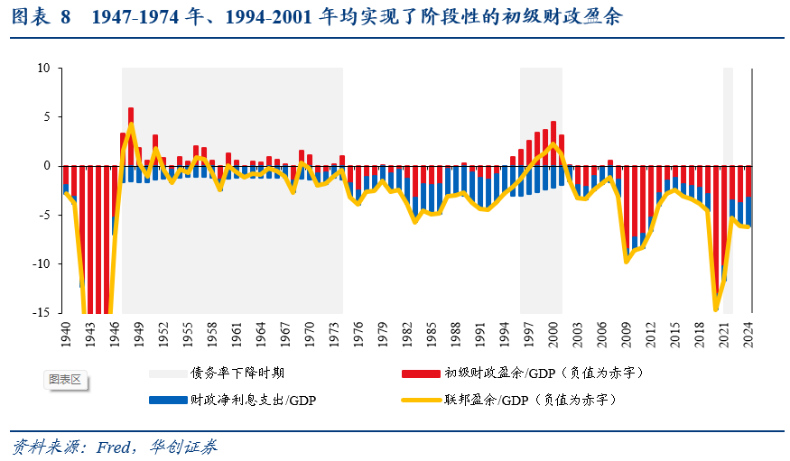 1947年至1974年间,初级财政盈余占GDP比重均值为0.9%,财政盈余可以抵消部分或全部净利息支出,从而降低财政赤字,1947年至1974年间财政赤字率均值仅为0.38%,此后财政赤字率快速提升到3%以上。