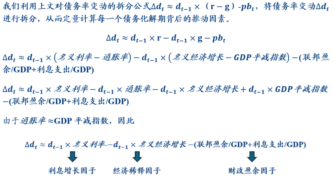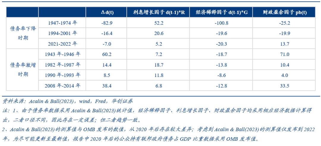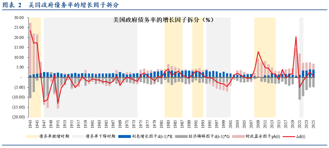 (3)财政盈余因子pb_t:战后财政减支+收入维持高位实现了初级财政盈余,财政盈余因子带来债务率下降25pp;其中,利息支出/GDP减少带来债务率下降35.8pp,财政赤字(联邦财政盈余/GDP)拖累债务率提升10.5pp。