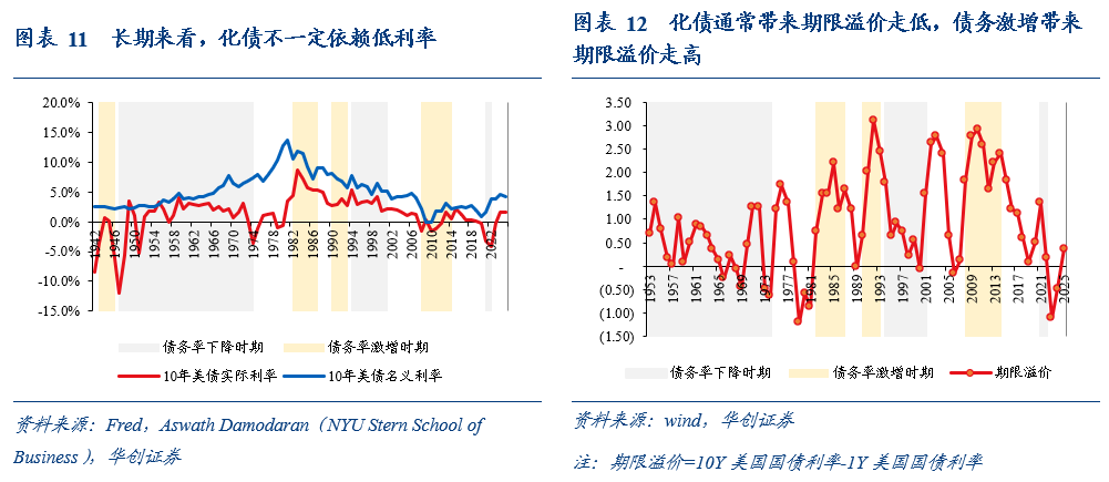 而从中长期趋势来看,化债不一定依赖低利率、债务激增也未必源自高利率。(1)成功化债期间,名义利率与实际利率并不一定会稳定在低位,利率水平根本上还是取决于化债期间的宏观经济环境,因为化债的根本在于将r-g维持在低位,而并非单纯将r维持在低位。不过化债期间,期限溢价通常走低,投资者所需的长期风险补偿普遍下调。(2)债务率激增的时期,由于通常有战争、经济衰退等时间冲击,因此利率中枢通常会人为抑制在偏低水平,债务激增的关键推动力还是财政赤字的大幅走高。但债务率激增的时期,期限溢价通常会大幅走高,即投资者对债务久期风险所需的补偿明显提升。
