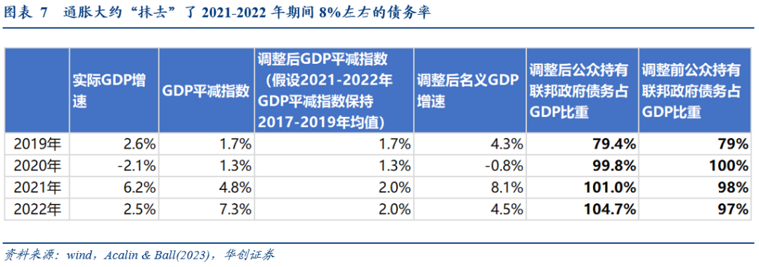 根据测算,通胀大约“抹去”了2021-2022年期间8%左右的债务率。测算方法为:假设2021-2022年美国实际GDP增速保持不变,但通胀并未大幅抬升,而是保持了2017-2019年均值水平;在该假设下我们重新估算2021-2022年的名义GDP增速。接着再以2021-2022年实际的公众持有联邦政府债务余额重新估算债务率。由此估算可得,2021-2022年期间的债务率将提升至101%、105%,说明了这一时期的超预期通胀帮助美国政府在账面上“抹去”了约8%的债务率负担,若扣除通胀效应,则美国的债务率负担在后疫情时代仍处于扩张通道。