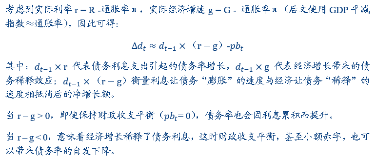 在上述债务率公式中,可以理解为将实际利率设置为:r <0 或 r– g < 0,此时即使存在小额财政赤字(pb_t略小于0),只要赤字额度小于r–g < 0 带来的稀释效应,债务率依然会下降。