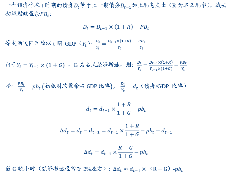 即pb_t > d_(t-1)*(r-g)。初级财政盈余=财政收入-(财政支出-债务利息支出),当差额为正,即为初级财政盈余,说明政府靠当年的财政收入,不仅能维持政府运转,还可以偿还债务利息。这一路径本质上是财政紧缩,通过提高税收或压缩公共开支来实现基本财政盈余,真实的还钱来减少政府债务余额。