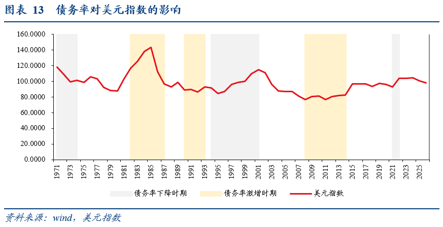 1982年-1987年:恶性通胀带来这一时期利率处于高位,高息差吸引海外资本流入美国;里根经济学的财政刺激尽管推高债务率但也带来了强劲的经济复苏;因而共同带来美元指数走强,呈现出美元指数不再定价高债务负担的特征。