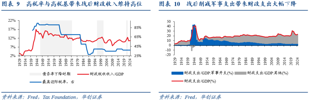 1947年-1974年期间为何能实现财政盈余?一则,财政支出方面,战后大幅削减开支,军事支出从战争高峰期大幅回落。1943-1944年美国国防支出占GDP比重超过40%,而这一比例在1947年快速下降至8%左右。不过1950年代朝鲜战争、1960年代越南战争,以及冷战时期的“太空竞赛”等又带来国防支出占GDP比重抬升至10%-15%左右。二则财政收入方面,战后边际税率依然在高位,例如个人所得税的最高边际税率仍维持在90%左右、1965年后降至70%,也处于历史高位;另外战后经济高增长带来税基较大,二者叠加共同带来战后财政收入维持高位,1947-1974年间财政税收收入/GDP均值高达14%。