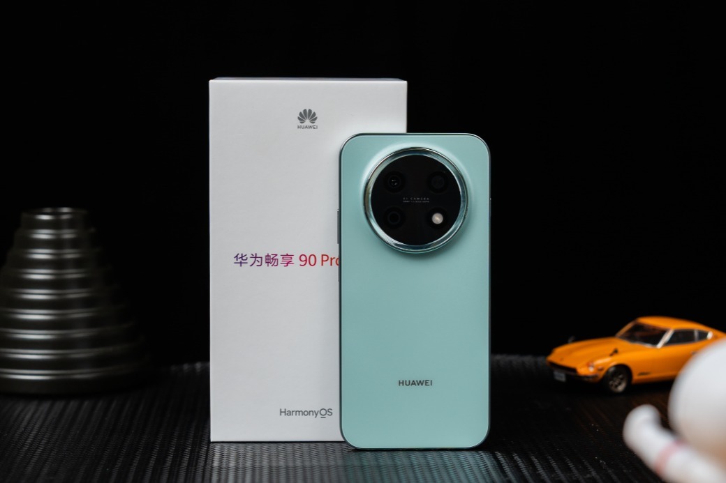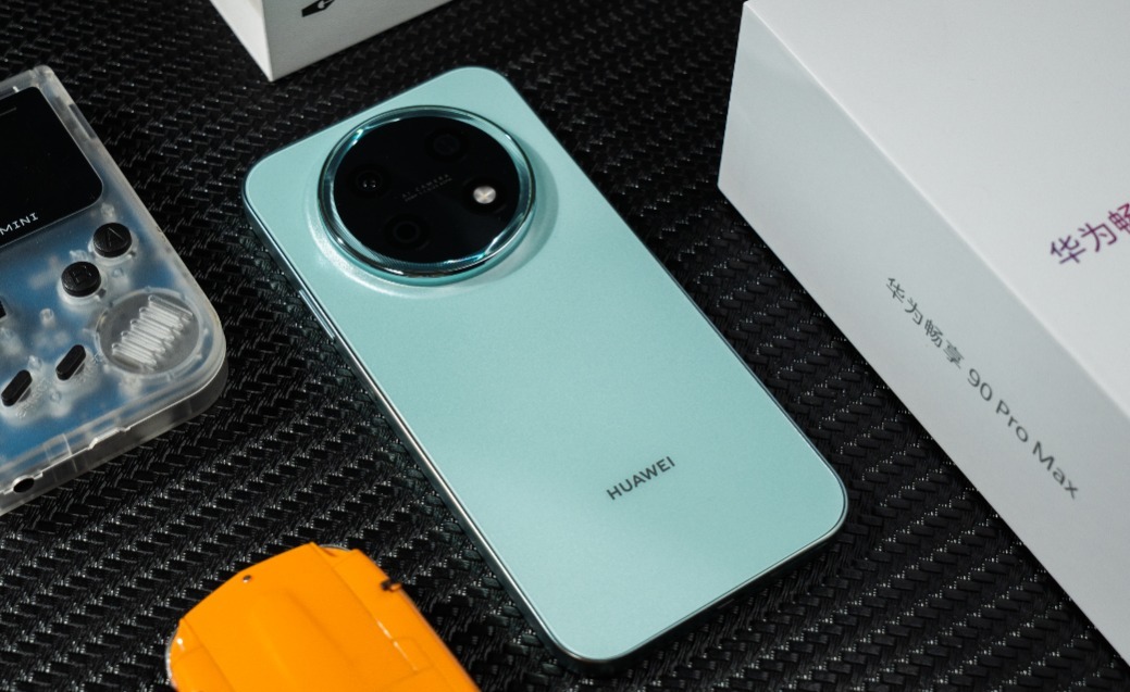拿到华为畅享 90 Pro Max 的第一时间,就能感受到它身上浓郁的华为家族基因。整机延续了华为经典的中轴对称设计语言,背部居中的星环影像模组布局规整利落,圆形模组内的镜头排列错落有致,整机的视觉观感很和谐。