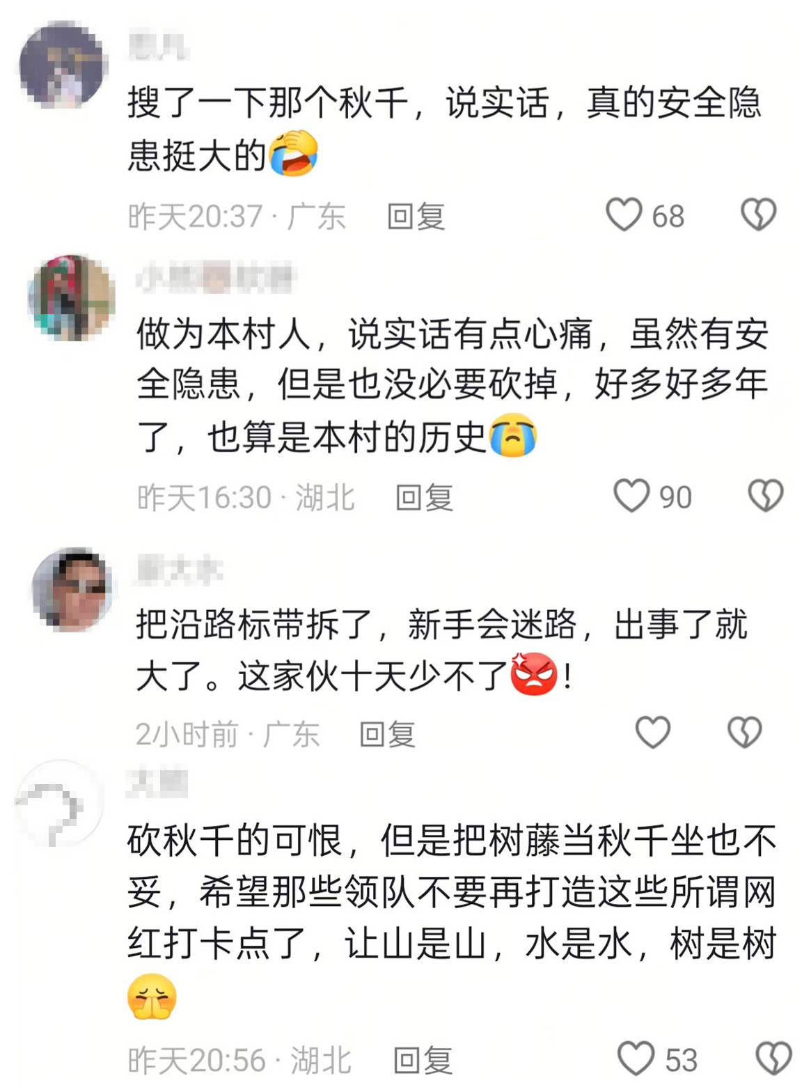 潇湘晨报·晨视频记者注意到,有到过此地的网友称秋千下方是平地,且多数人不会在现场长时间停留,他认为或许有一定安全隐患,但不至于以破坏自然的方式进行消除。
