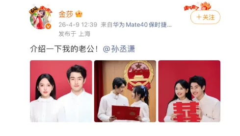 4月9日,金莎在微博晒出与孙丞潇结婚照,官宣两人结婚消息。