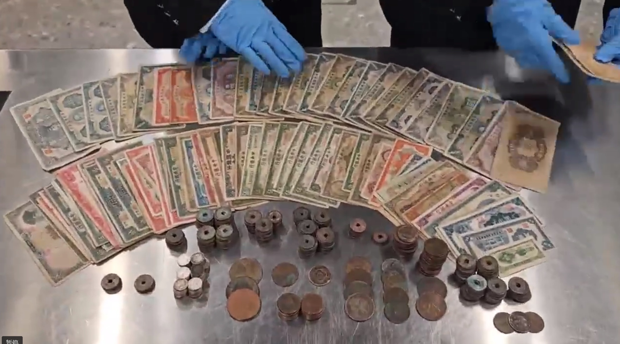 海关关员经开箱查验,发现箱内物品均使用塑料气泡膜分隔包装,关员逐一拆开气泡膜发现大量疑似文物的金属钱币、纸质钱币,还有大量疑似化石的贝壳形状物品。