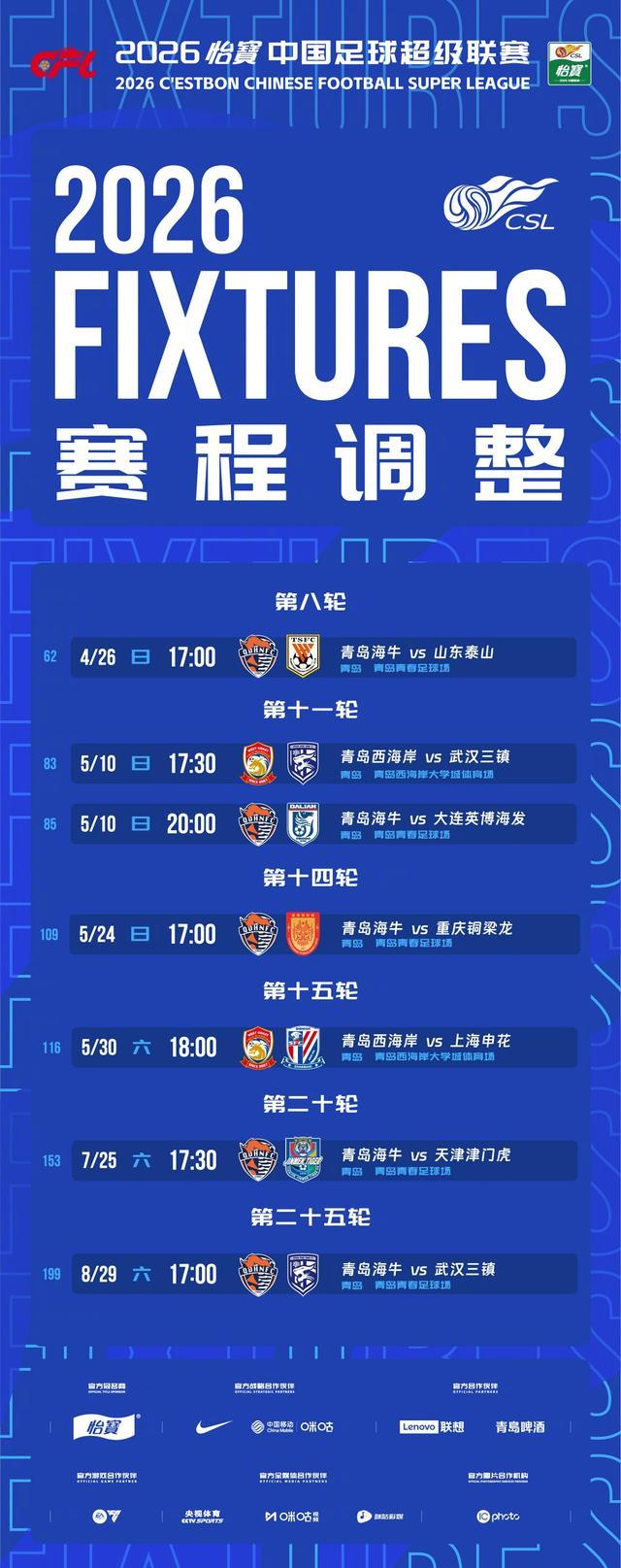 为满足球迷观赛需求,经主场俱乐部申请,并协商属地赛区、客队俱乐部及相关方同意后,现决定调整2026怡宝中超联赛青岛海牛、青岛西海岸俱乐部部分主场的比赛时间,其他比赛安排不变,具体调整如图。