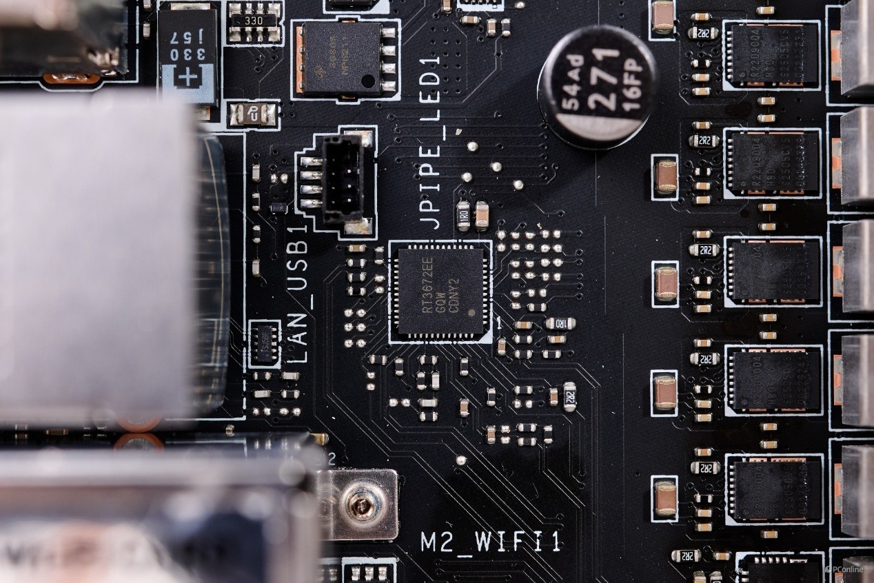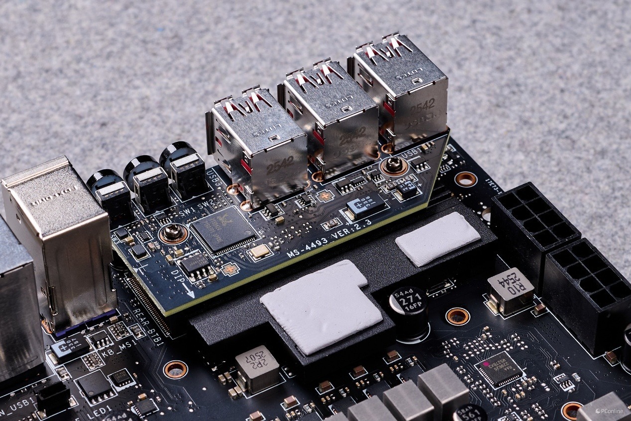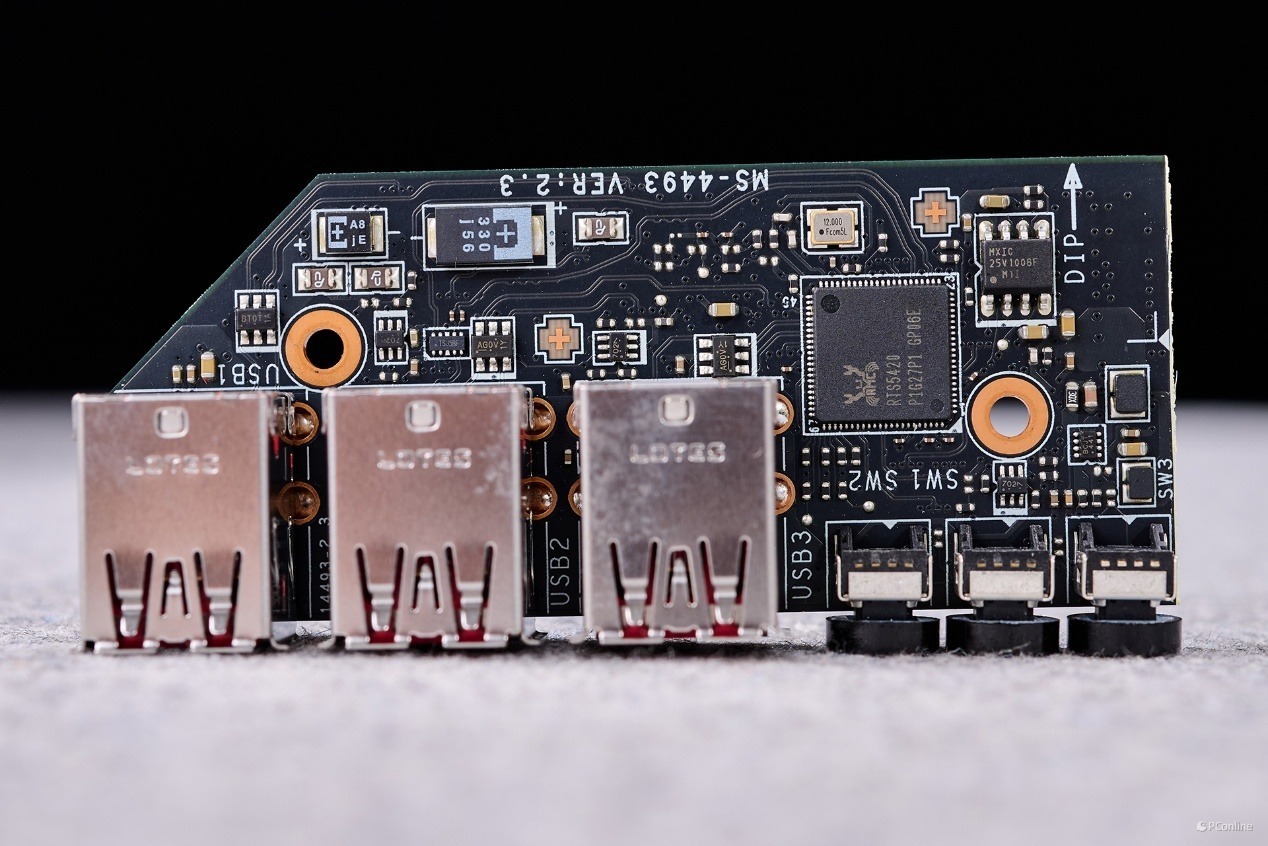 这个设计我们在X870E CARBON WIFI暗黑主板上也见到过,6个USB接口主要是这款小小的瑞昱RTS5420芯片扩展。