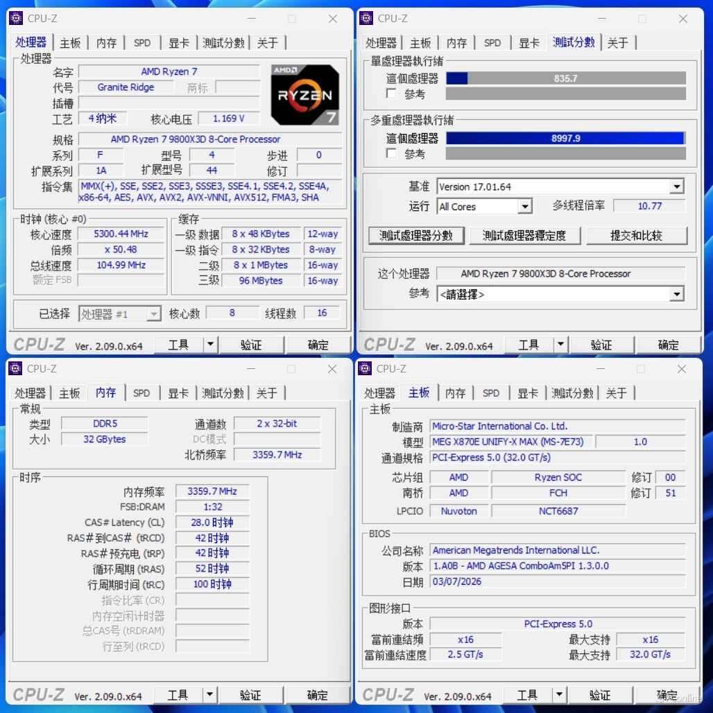 正式上机后,我们首先通过CPU-Z查验平台信息并进行基准测试。本次测试选用的座驾是微星MEG X870E UNIFY-X MAX 暗影主板,作为超频旗舰型号,其不仅拥有奢华的用料,更完美支持PCIe 5.0高速标准。