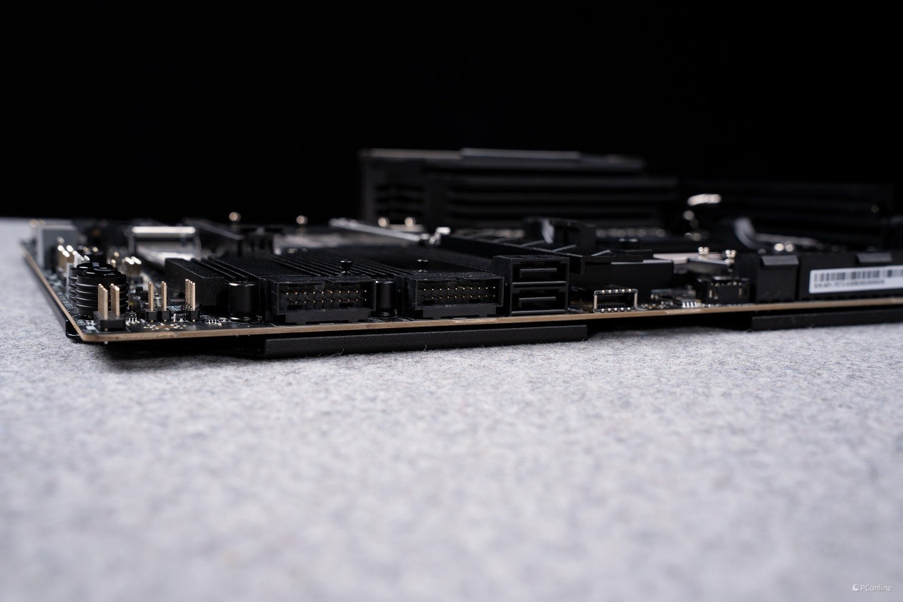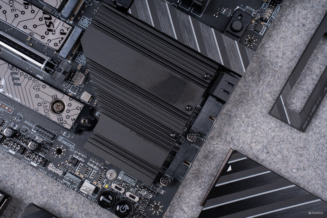 视角转到右下角的散热装甲,有一说一,这块散热装甲还是挺有份量的,这里便是主板的南桥芯片所在地。