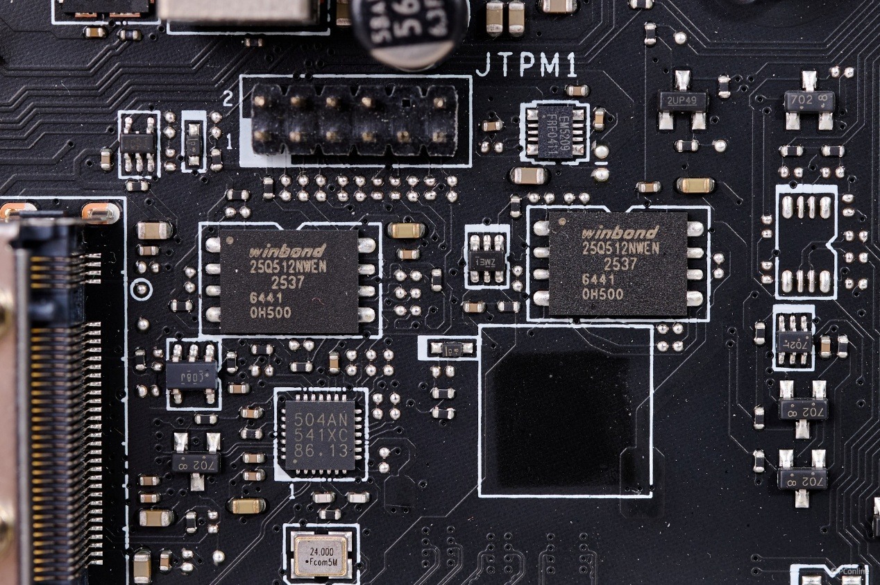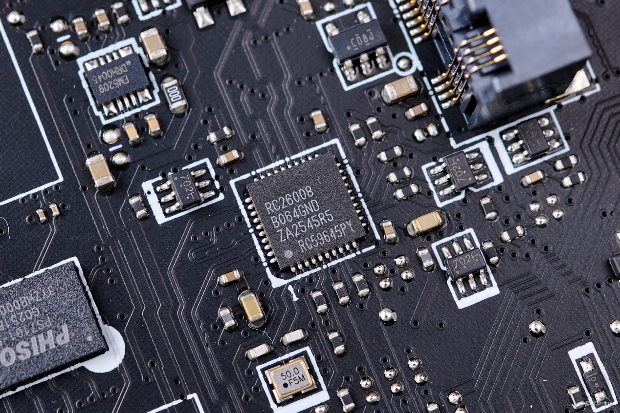 在主控芯片的下方还有一颗时钟发生器,型号是瑞萨RC26008。这也意味着这款主板能够对处理器进行超外频,极客玩家可以尽情释放硬件性能。