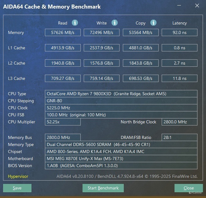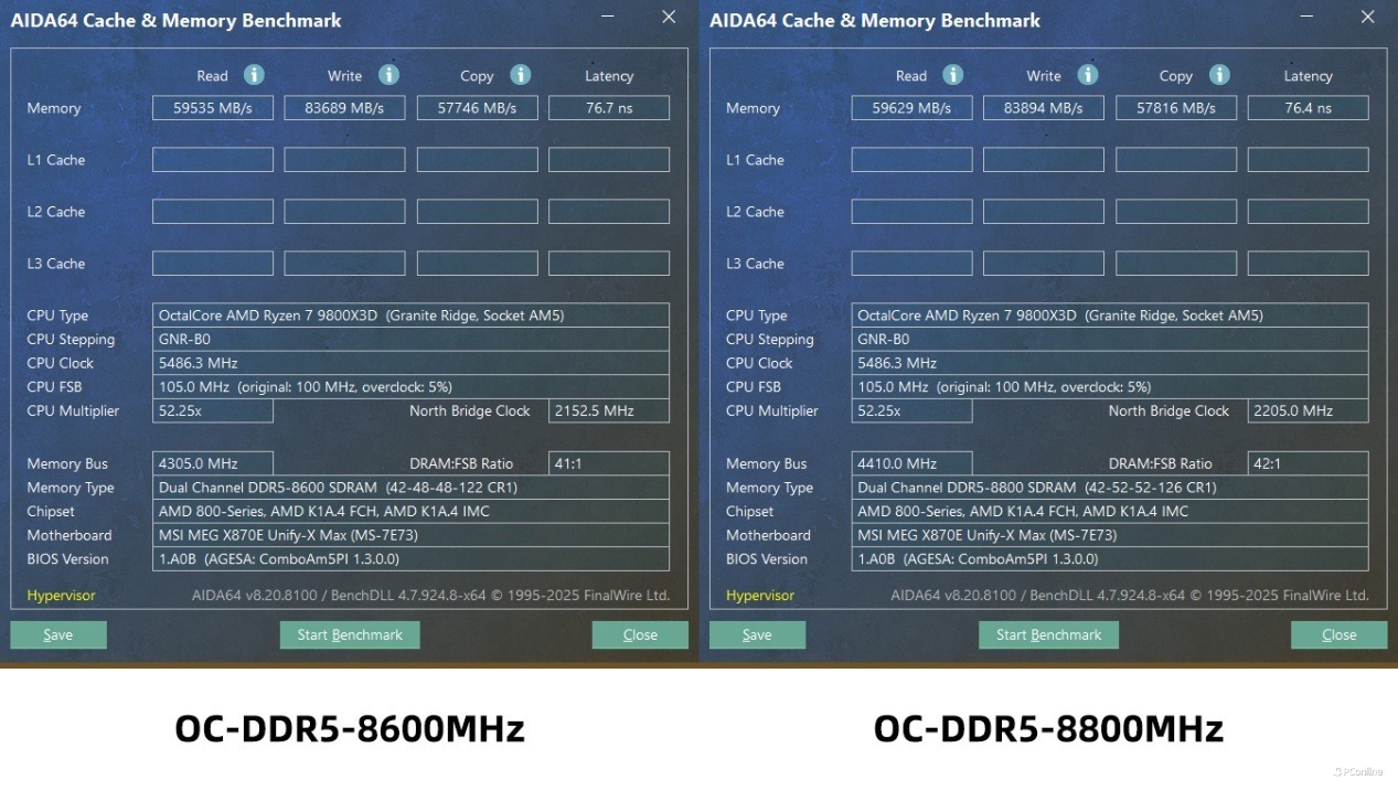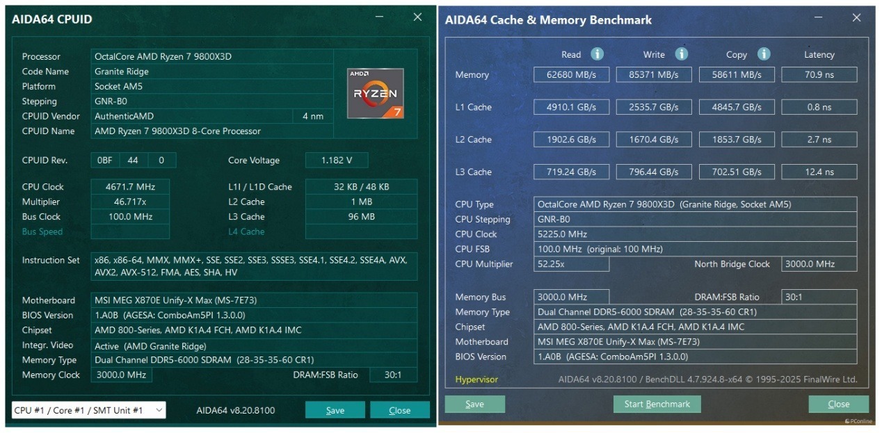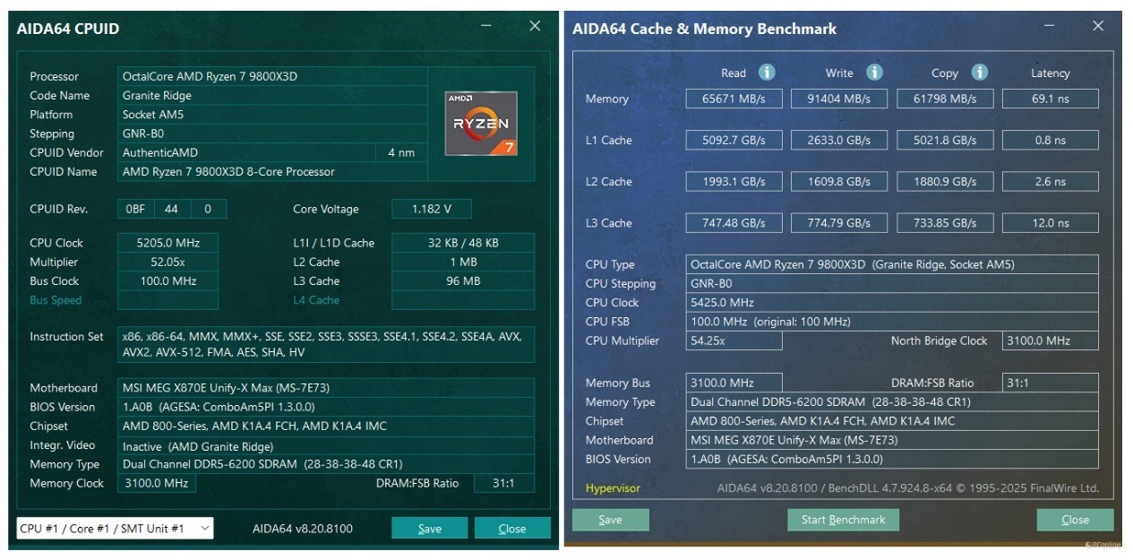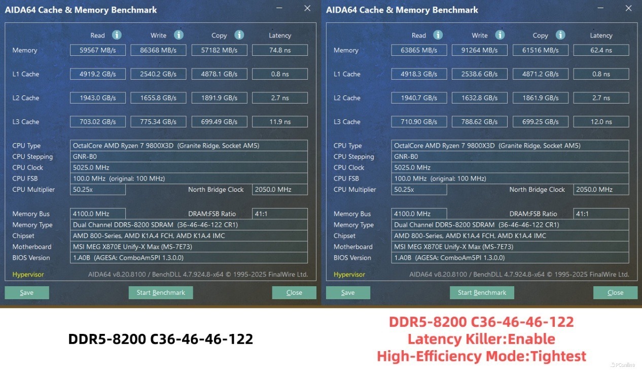 接着我们还测试了一下,在微星MEG X870E UNIFY-X MAX 暗影主板上,DDR5-8200MHz 也能轻松点亮!并且还能开高频低延迟,内存性能更是冲上了新的境界,读取性能可以来到63865MB/s,写入也飙到了91000MB/s以上,复制也进一步提到了61000MB/s左右,最夸张的还是内存延迟,直接压到了62.4ns。不得不说,这确实是有些惊喜了,完全就是顶级X870E主板才有的水准。