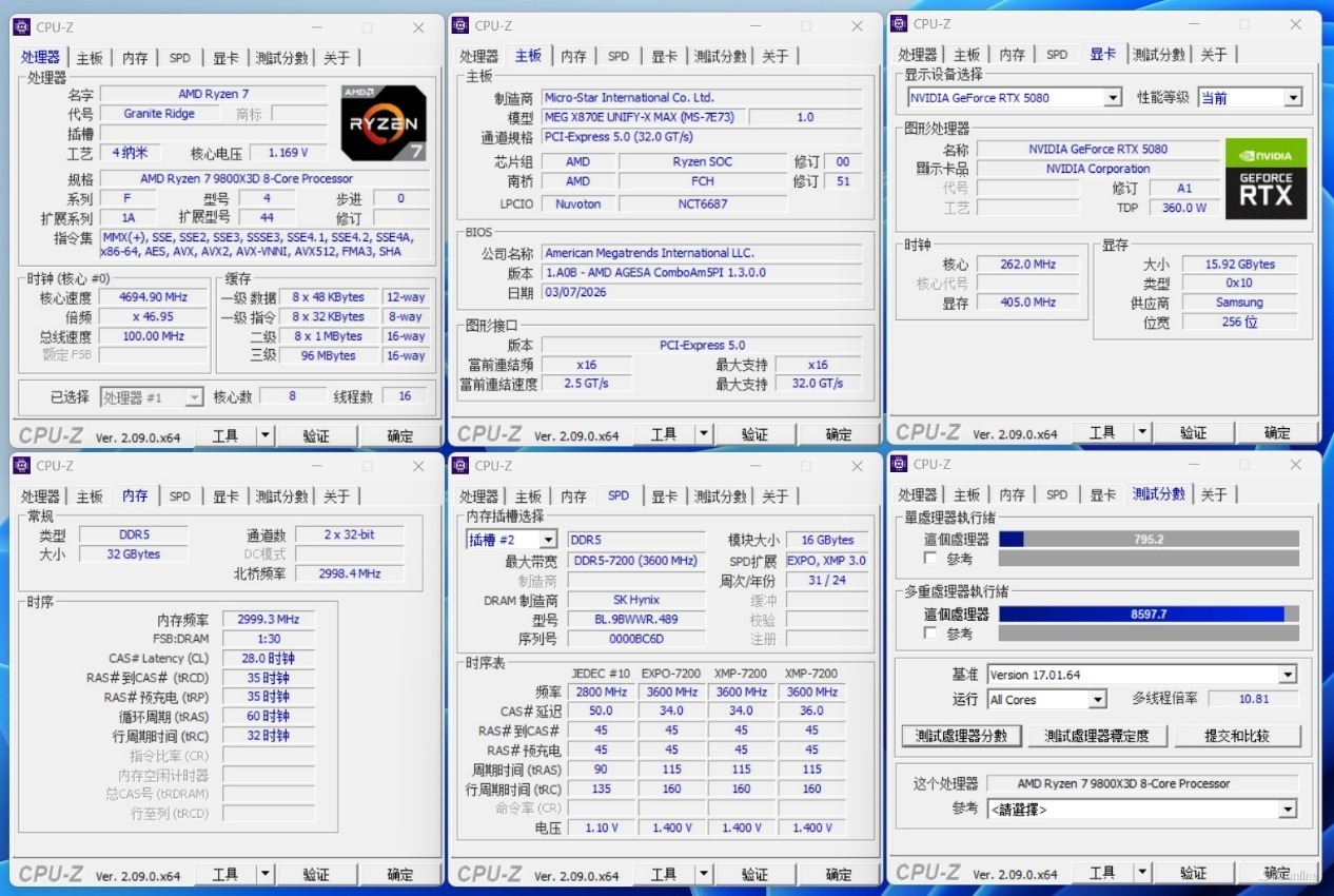 在性能实测中,9800X3D的潜力被彻底激发,全默认状态下单核得分飙升至795.2,多核成绩更是达到了8597.7。这一表现充分证明了微星MEG X870E UNIFY-X MAX 暗影主板强悍的供电设计并非徒有其表,在应对9800X3D这种高性能处理器时显得游刃有余,展现了顶级X870E平台应有的统治力。