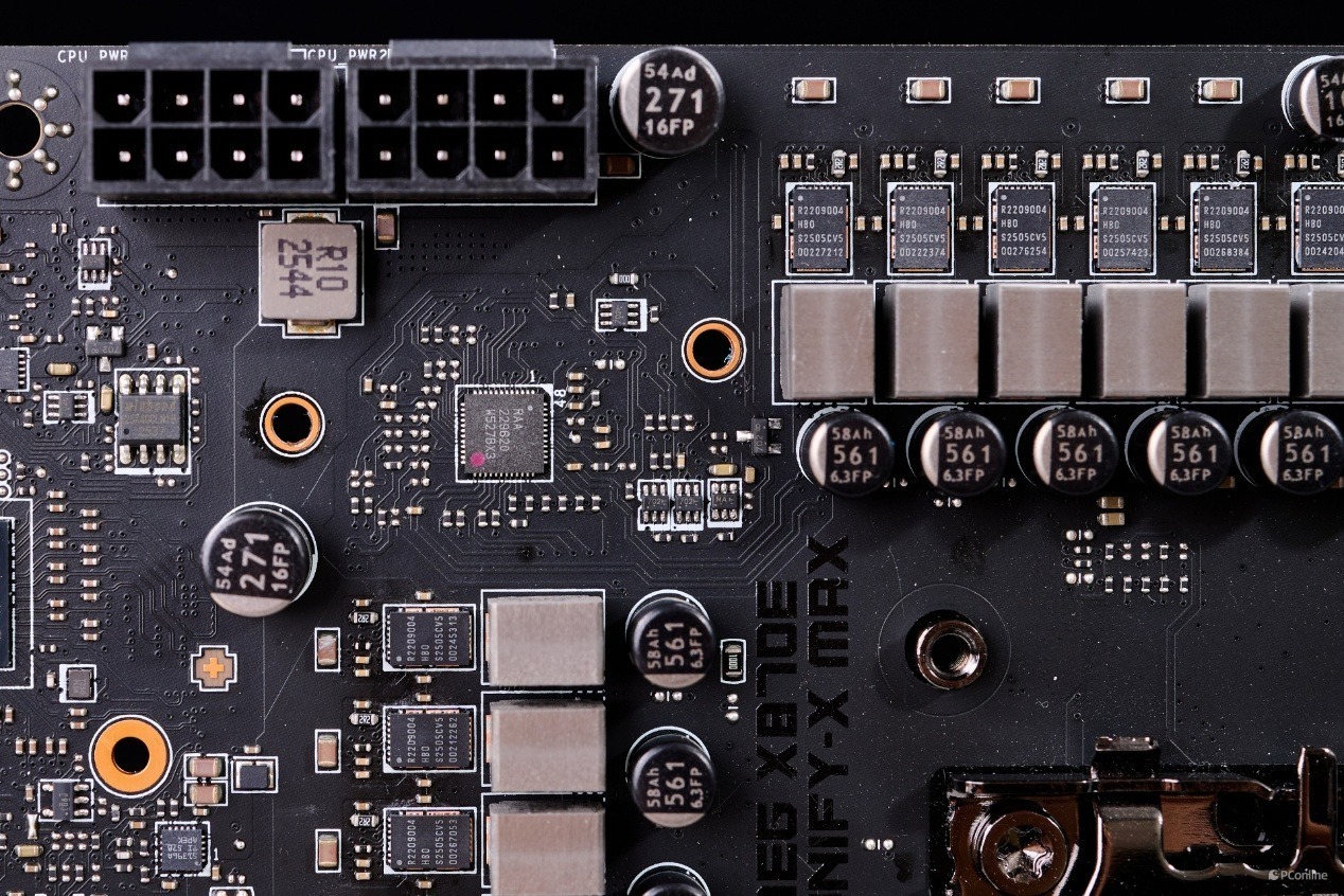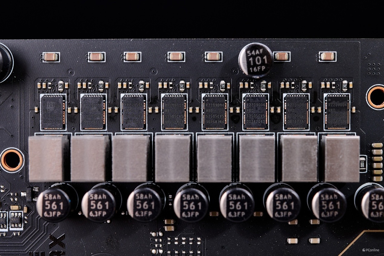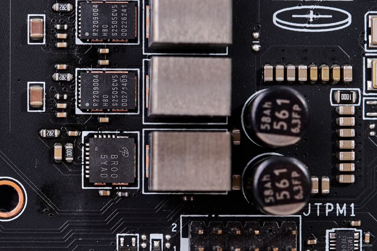 再细看主板电路可以看到,主板上的18相核心供电以及2相SOC供电均采用独立的Dr.MOS芯片,为瑞萨的R2209004