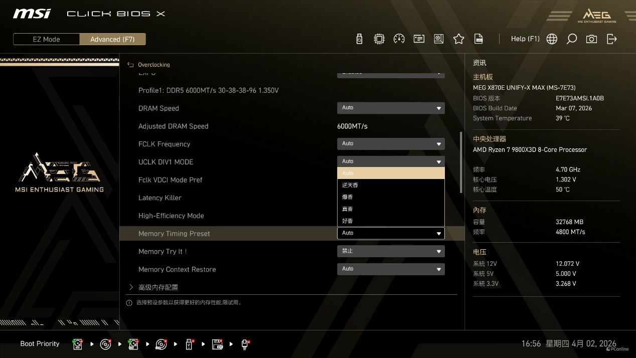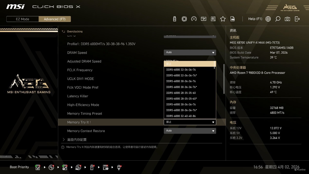 其中,Memory Try It! 功能为新手玩家提供了一站式的内存超频解决方案,内置了数十组经过验证的 DDR5 内存超频预设,从 DDR5-6000 到 DDR5-10000+,覆盖了不同频率、不同时序的组合,玩家只需选择对应的预设,保存重启即可完成超频,无需手动调节任何参数,即便是零基础的新手,也能一键解锁内存的性能潜力。