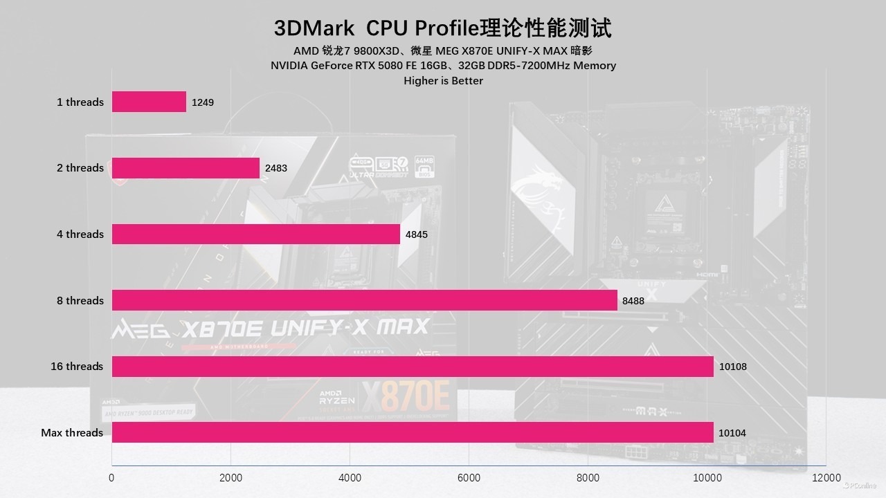 而在3DMark的CPU Profile测试中,9800X3D的表现也是相当给力,实测9800X3D的单线程分数为1249,最大线程分数为10104,表现不错,作为一款专为游戏而生的CPU,这个成绩已经完全能够满足主流用户的需求了。