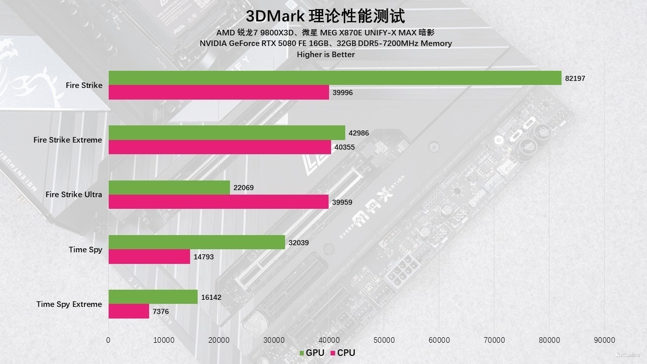 随后我们转战3DMark进行理论性能摸底。无论是考验DX11性能的Fire Strike,还是针对DX12环境的Time Spy,这套平台的表现都堪称完美。特别值得一提的是,在Fire Strike物理测试中,9800X3D的得分势如破竹,一举突破了40,000分大关。